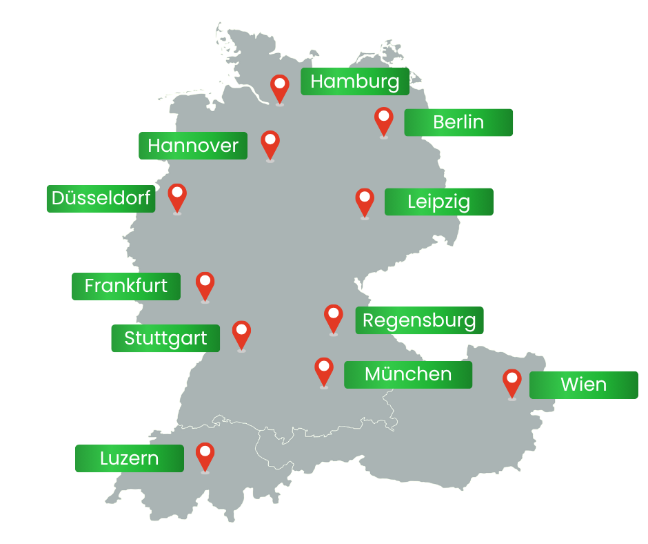 Hamburg • Hannover • Berlin • Düsseldorf • Leipzig • Frankfurt • Stuttgart • Regensburg • München