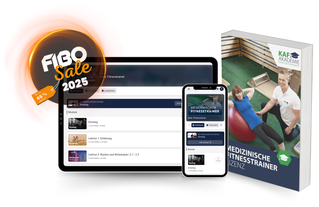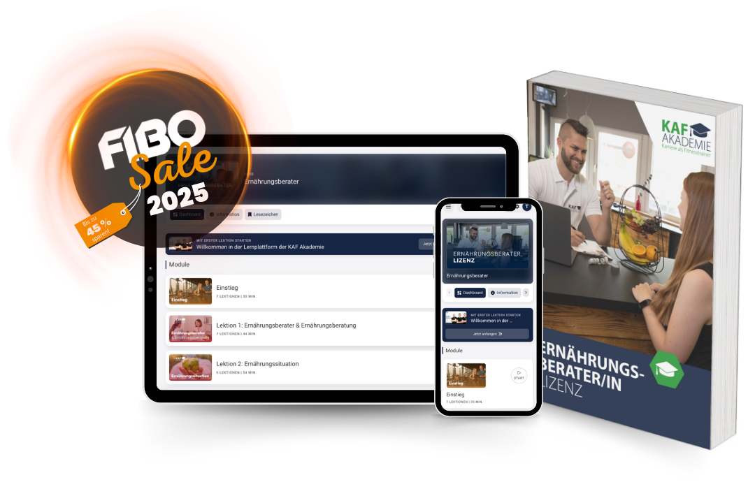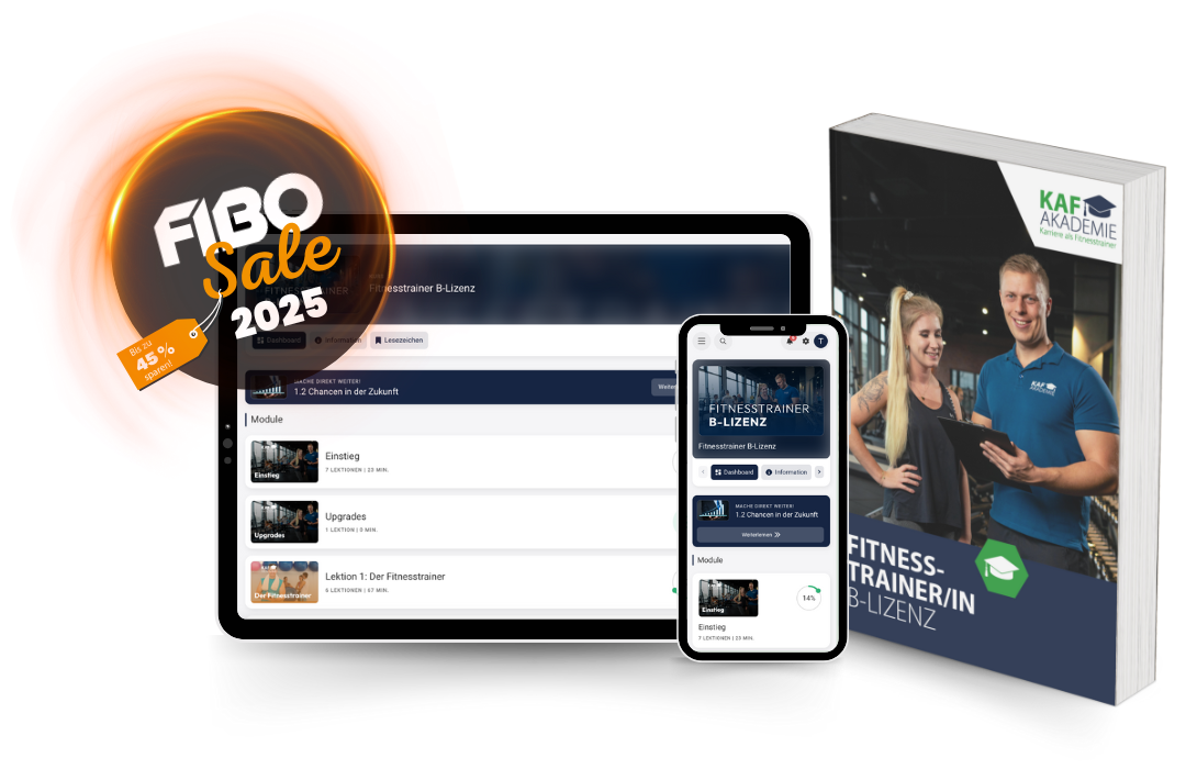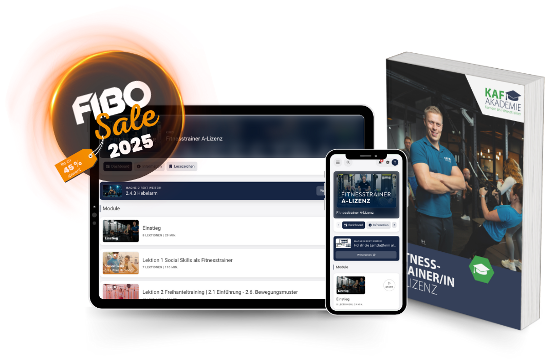 Anmerkung: Auf den Produktbildern sind Dekorationselemente enthalten, wie z.B. IPad, Handy, Buch… Diese sind nicht im Kaufpreis enthalten. Du erhältst deine Zugangsdaten zu unserer Lernplattform und den Lehrmaterialien per E-Mail. *Die Bezeichnung “Master Fitnesstrainer” ist eine von der KAF Akademie intern vergebene Bezeichnung für das Bestehen der fünf Fernlehrgänge: Fitnesstrainer B-Lizenz (ZulNr.:7369420), Fitnesstrainer A-Lizenz (ZulNr.:7404621), Personal Trainer Lizenz (ZulNr.:7396321), Ernährungsberater Lizenz (ZulNr.:7427522) und medizinische Fitnesstrainer Lizenz (ZulNr.:7421622). Diese einzelnen Fernlehrgänge sind von der ZFU staatlich geprüft und zugelassen. Die Bezeichnung “Master Fitnesstrainer Paket” ist keine staatliche anerkannte Abschlussbezeichnung. **zzgl Prüfungsgebühr je Ausbildung i.H.v. 99€