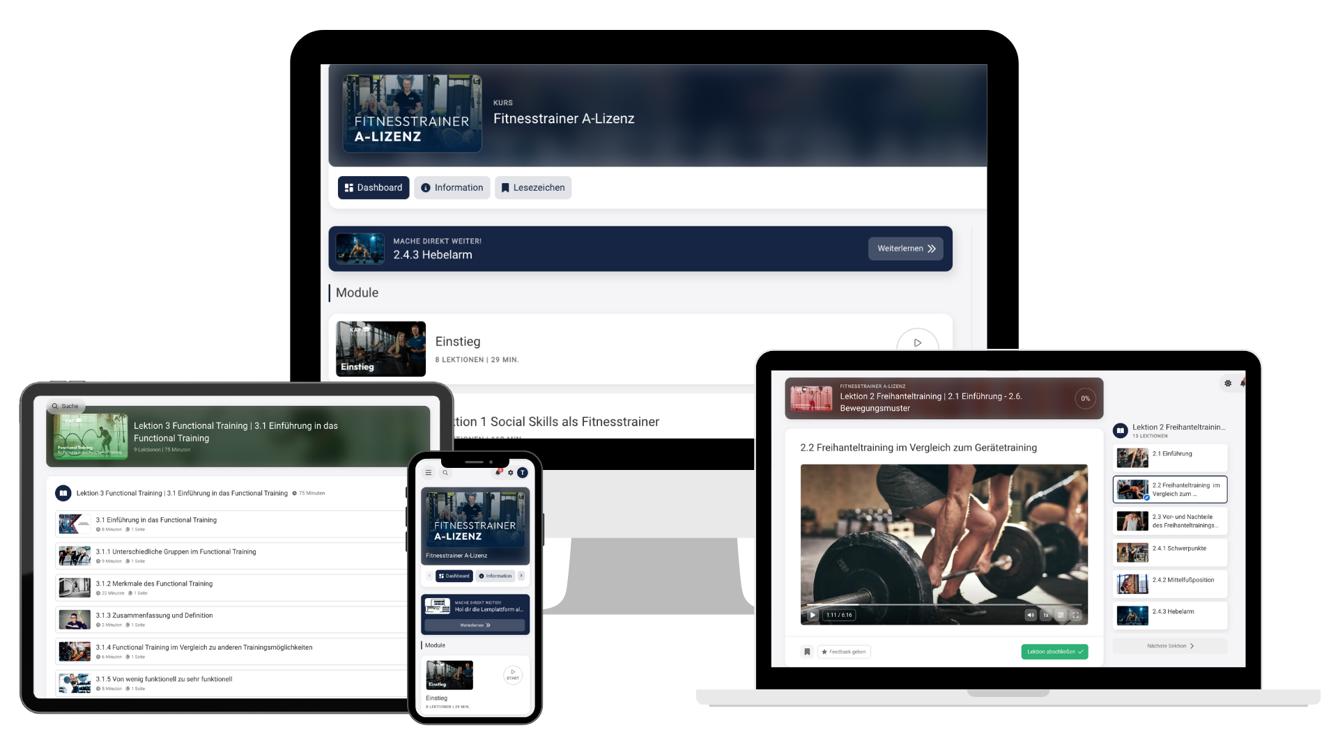Du meldest dich online für die Fitnesstrainer A-Lizenz an. Bei 10 Stunden pro Woche wirst du ca. 3 Monate benötigen. Von unserer Seite geben wir dir keine maximale Lehrgangsdauer an. Dadurch bleibst du zu 100% flexibel. Nach der Ausbildung hast du lebenslangen Zugriff auf die Inhalte der Ausbildung.