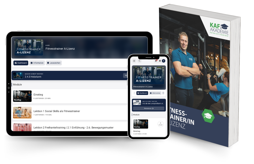 Das Besondere bei der KAF Akademie: ALLE Inhalte, die im Skript enthalten sind, werden von unserem Dozenten & Fitnesstrainer Tim leicht verständlich mit hochwertigen 4K-Videos erklärt! Wir gehen sicher, dass du wirklich alles verstehst und so viel wie möglich lernst, indem wir kein prüfungsrelevantes Thema auslassen.