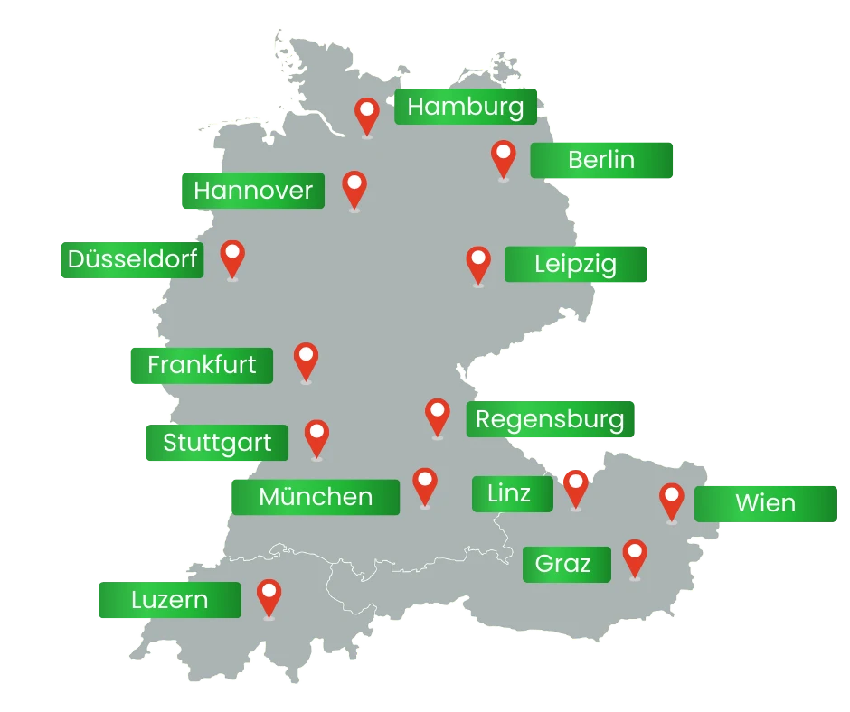 Hamburg • Hannover • Berlin • Düsseldorf • Leipzig • Frankfurt • Stuttgart • Regensburg • München