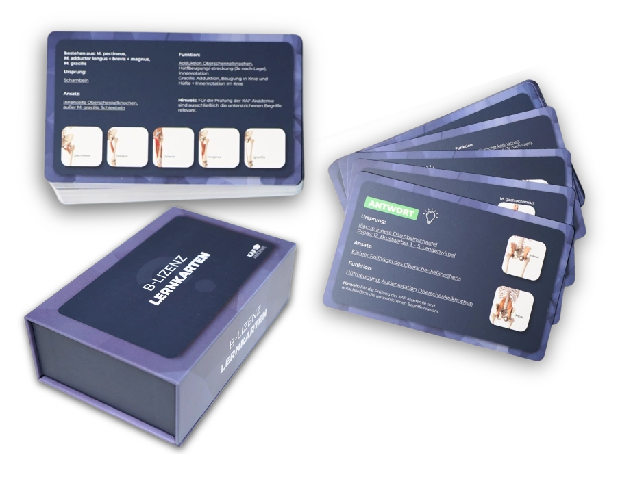 Mit den 96 Lernkarten testest du selbstständig dein Wissen über den Prüfungsstoff der B-Lizenz. Von Anatomie, Physiologie über Trainingslehre bis hin zum Thema Ernährung – ideal, um dich aktiv auf die Prüfung vorzubereiten.