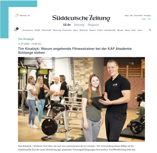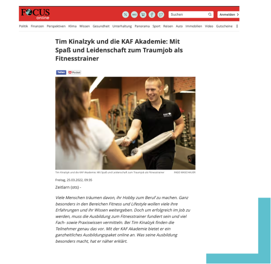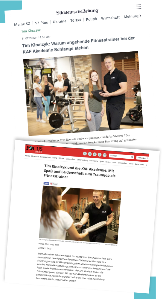 Tim Kinalzyk ist Gründer der KAF (Karriere als Fitnesstrainer) Akademie, einer Online-Akademie mit staatlich zugelassenen Fernlehrgängen, in denen alle relevanten Kenntnisse und Fähigkeiten vermittelt werden, um den Job als Fitness- oder Personal Trainer besonders gut ausführen zu können.